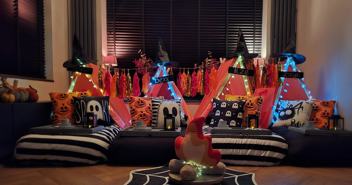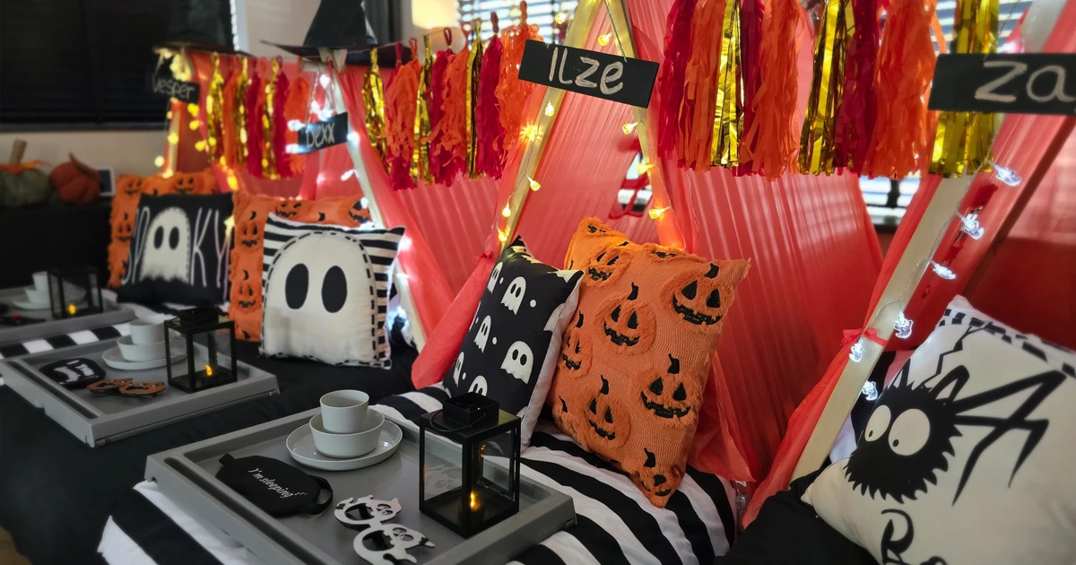 Geen stress, geen gedoe. Wij leveren jouw Halloween Tipi Tent Slaapfeestje compleet met enge maar gezellige decoratie, lichtjes en accessoires. Alles wat je nodig hebt voor een betoverend en spookachtig nachtavontuur!