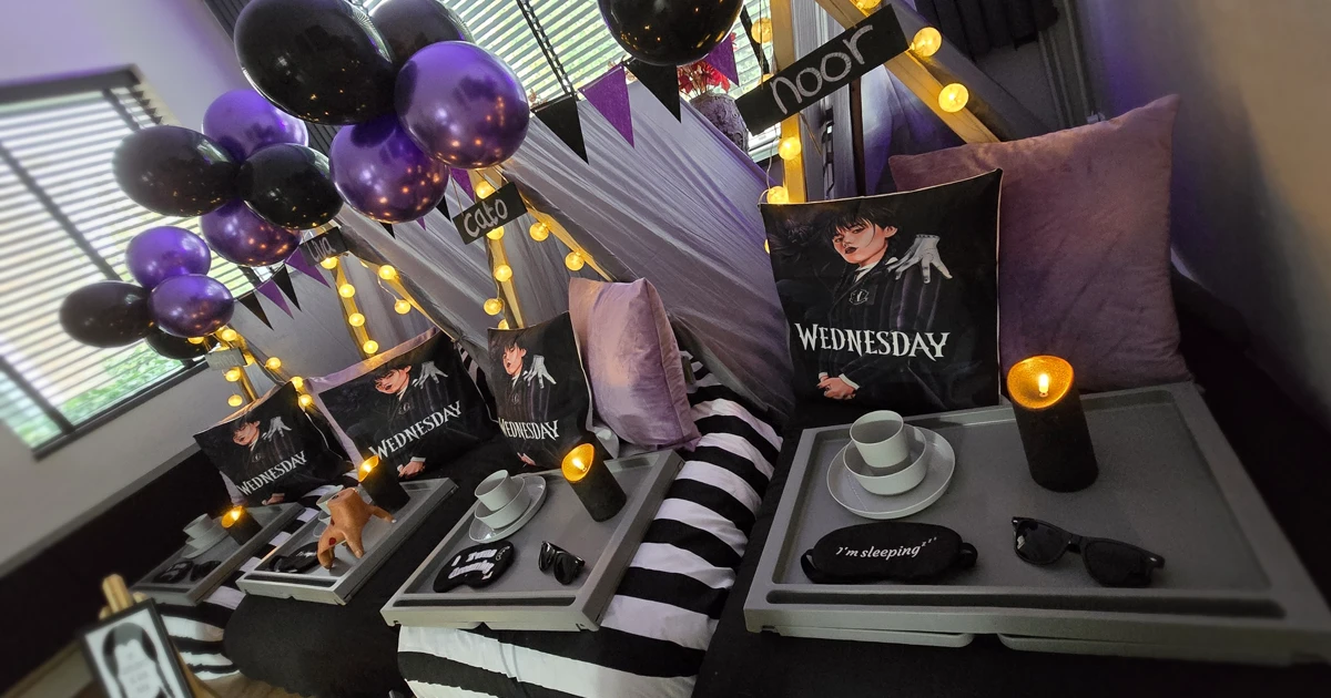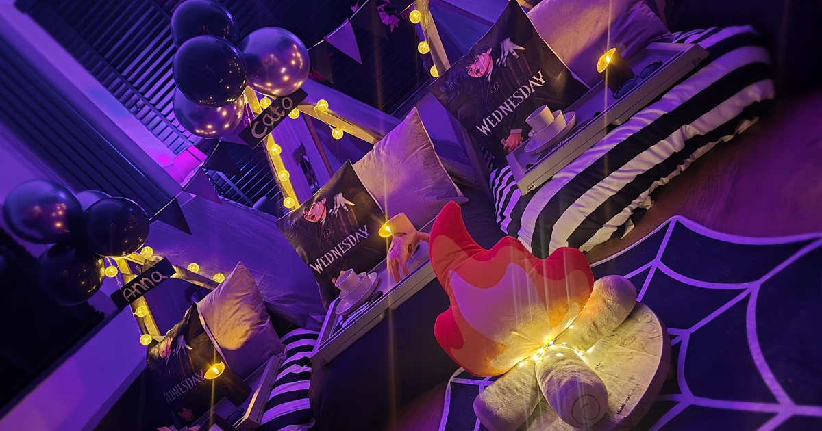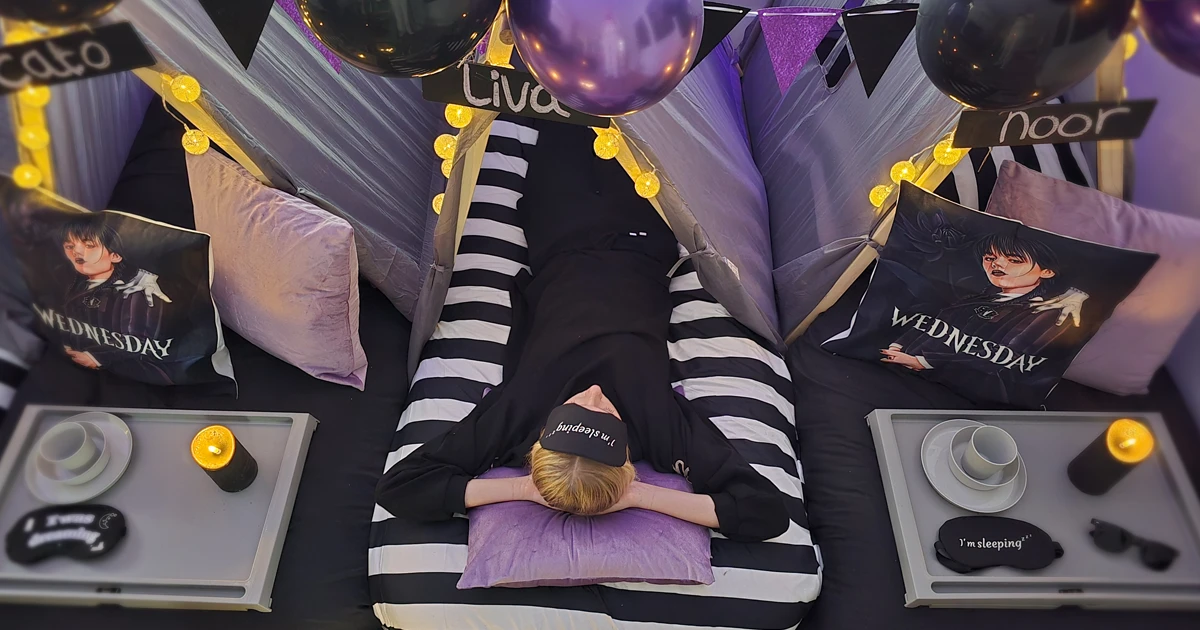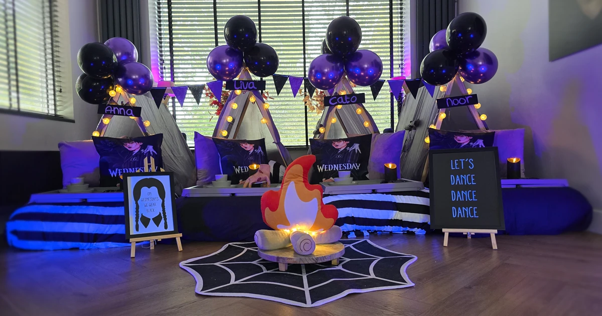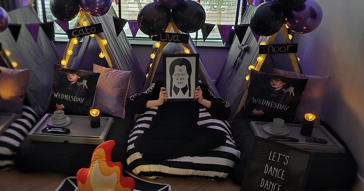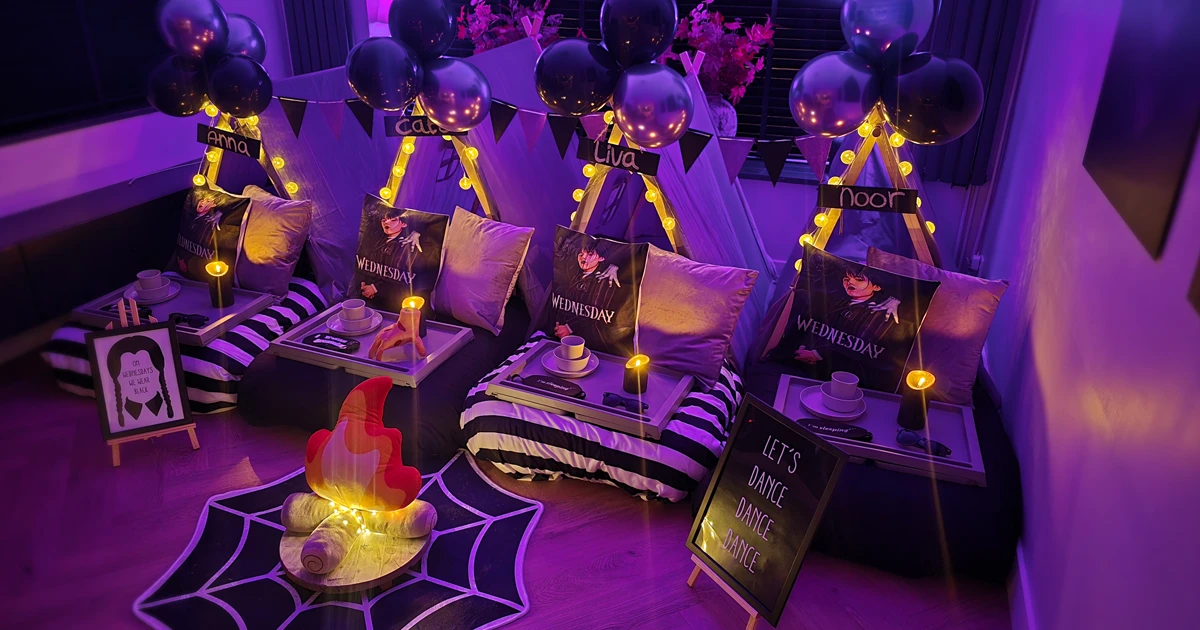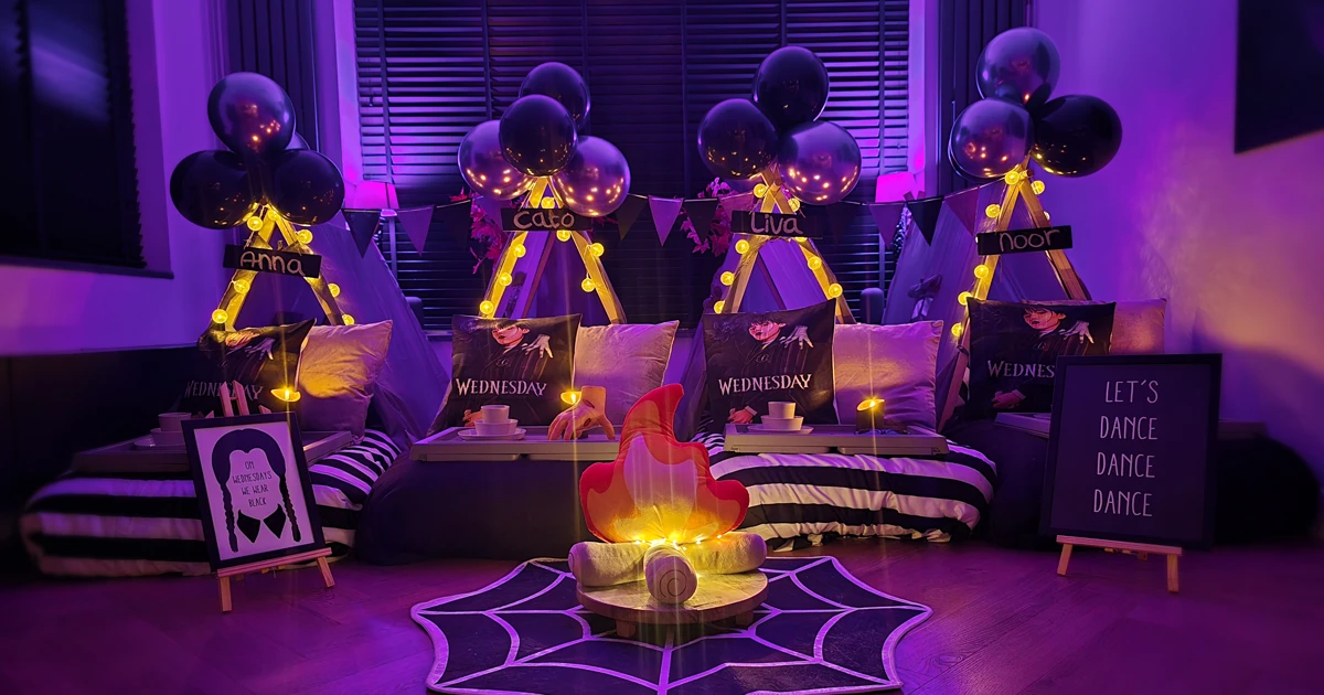 Ons Wednesday Tipi Slaapfeestje is niet zomaar een feestje, maar een mysterieuze ervaring vol stijl, duistere charme en een vleugje humor. De tipi’s zijn omgetoverd tot een mini Nevermore Academy, compleet met zwarte accenten, sfeerverlichting, griezelige accessoires en natuurlijk Wednesday’s favoriete kleuren: zwart en paars. Perfect voor echte fans die houden van een tikje griezel én een vleugje klasse.