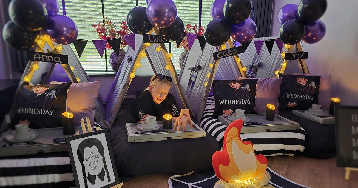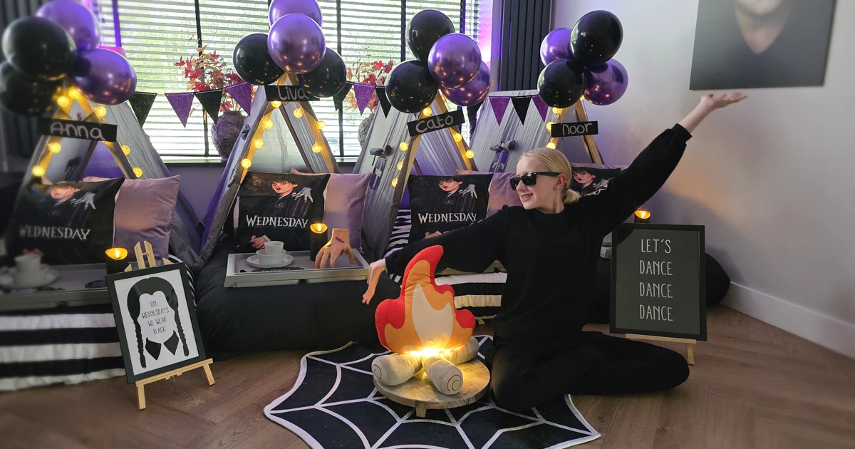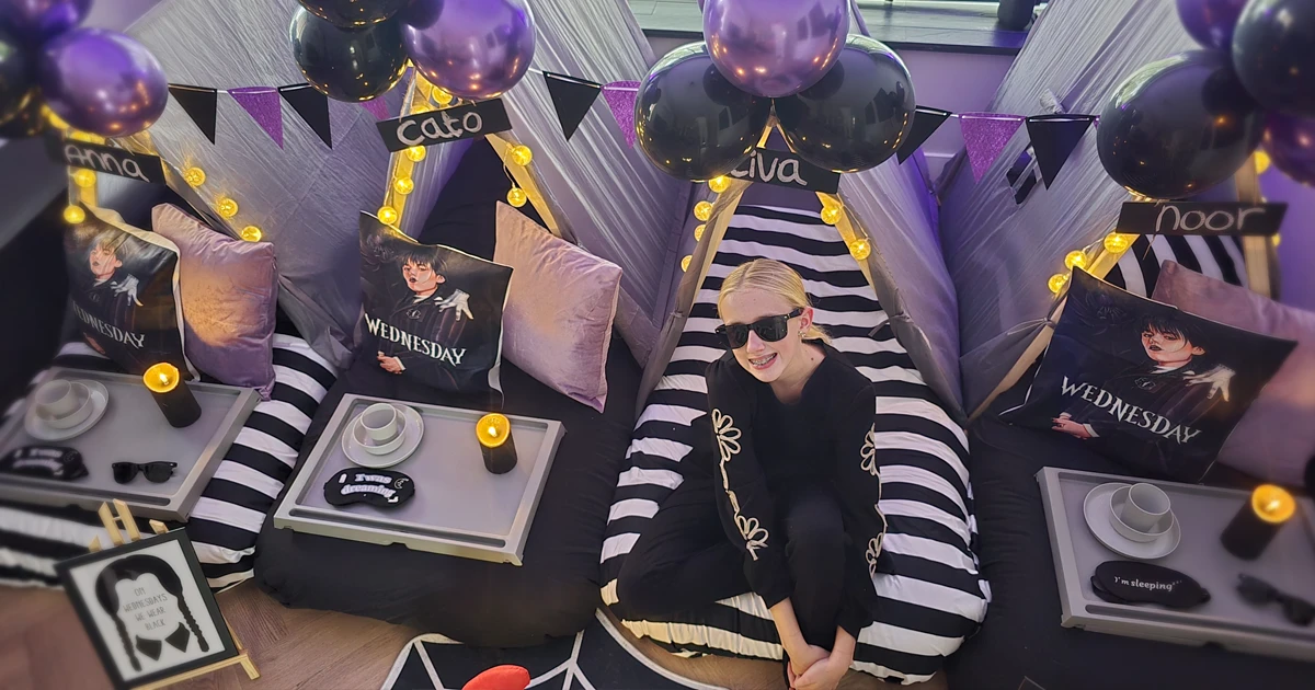 Tipi tent Slaapfeestje huren met Wednesday thema