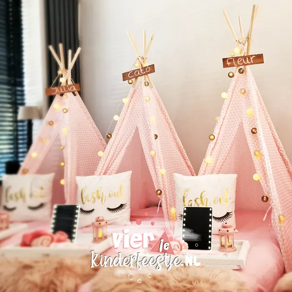 Bij VierJeKinderfeestje.nl kun je complete tipi slaapfeestjes huren, inclusief tentjes, luchtbedden en accessoires.